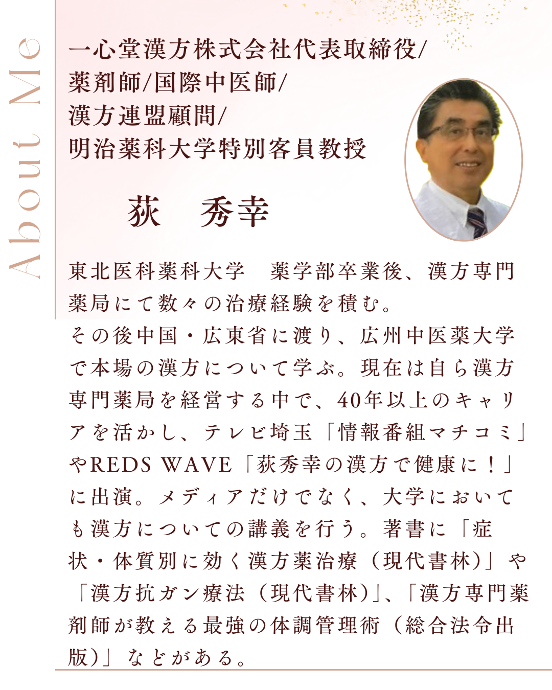 | 代表取締役 | 荻 秀幸 (薬剤師・明治薬科大学特別客員教授・漢方連盟顧問) |